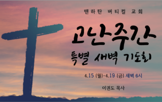 고난주간 특새 기간은 4월 15일(월)-19일(금)이며 시간은 6:00am에 시작합니다.