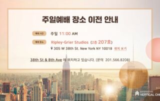 주일예배 장소를 38th St 과 8th Ave 에 있는 Repley-Grier Studio로 이전하게 되었습니다.